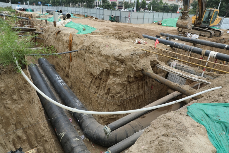 行百里者半九十,進入8月,隨著工期臨近,東部新區(qū)集中供熱全覆蓋工程各標段現(xiàn)場愈加繁忙,壓在建設(shè)者們肩頭的擔(dān)子日漸吃緊。位于一標段西端的紅旗東街韓信路口為東部新區(qū)與主城區(qū)管網(wǎng)銜接處,由于地面交通繁忙,地下天然氣管道、國防光纜、城市強排污水管道等三方管線縱橫交錯,且緊鄰高壓線桿,溝槽深達4米多,施工困難重重;施工處靠近外灘首府環(huán)境監(jiān)測點,環(huán)保壓力大。根據(jù)規(guī)劃要求,管網(wǎng)需在此處由南至北穿越紅旗東街,為確保施工安全順利,并最大程度減少對交通的影響,施工采取半幅路面作業(yè)方式,先行對路南南側(cè)圍欄施工,經(jīng)過此前幾天緊張作業(yè),管網(wǎng)過路南側(cè)已順利完工,路北側(cè)于8月13日下午開始圍欄作業(yè)。